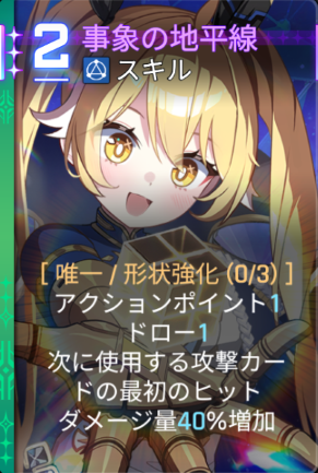 使うたびに強化が積み重なる育て型カードで、強化する毎に「AP+1・ドロー+1・次の攻撃カードのダメージ+40%」がランダムに上昇します。